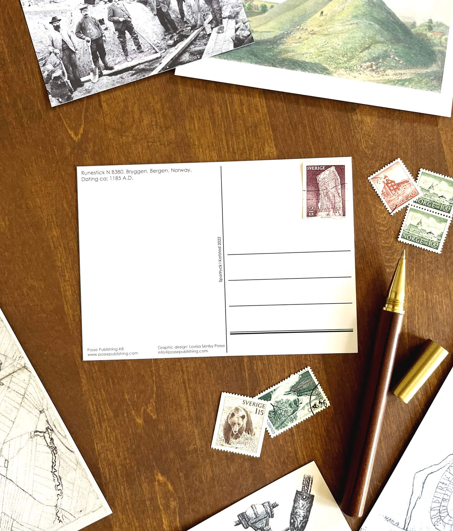 Ett stilrent vykort med motiv från en runsticka funnen vid Bryggen i Bergen, Norge. Ristningen, som dateras till omkring 1185 e.Kr., består av en hälsning och en uppmaning till de gamla gudarna: